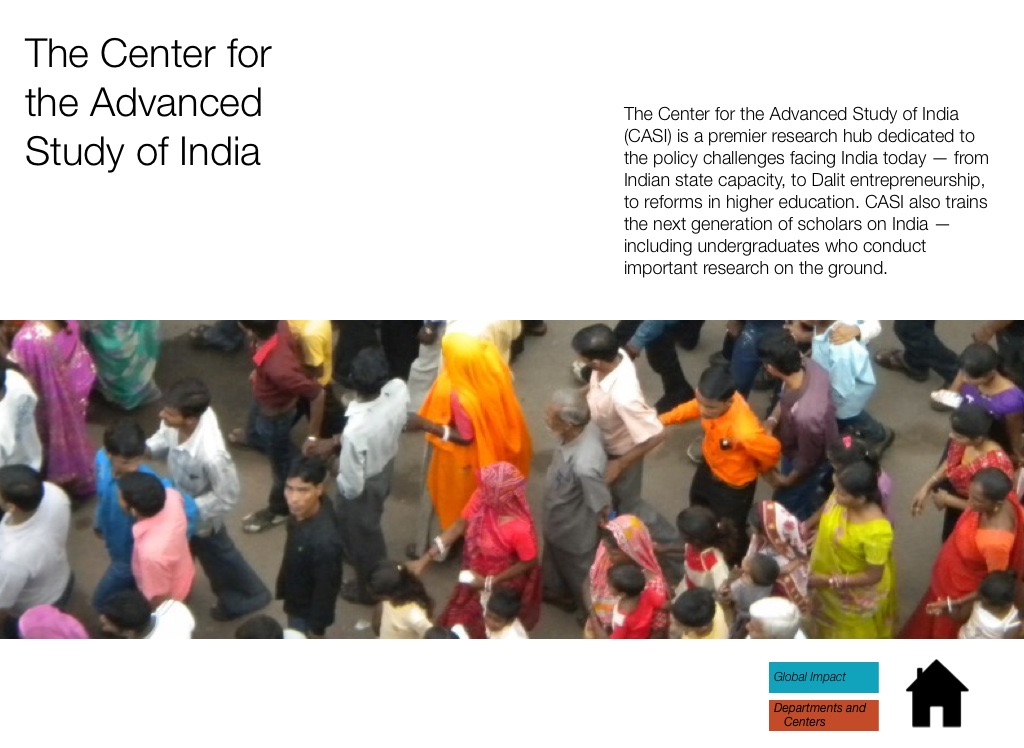 The Center for the Advanced Study of India (CASI) is a premier research hub dedicated to the policy challenges facing India today — from Indian state capacity, to Dalit entrepreneurship, to reforms in higher education. CASI also trains the next generation of scholars on India — including undergraduates who conduct important research on the ground.