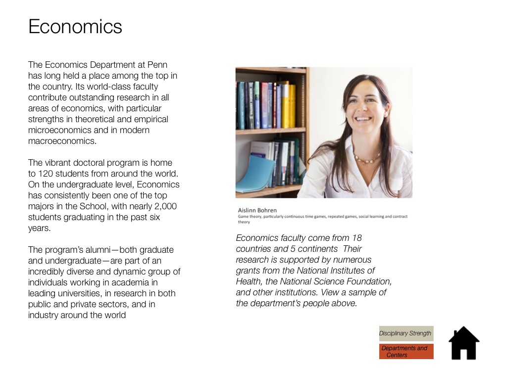 The Economics Department at Penn has long held a place among the top in the country. Its world-class faculty contribute outstanding research in all areas of economics, with particular strengths in theoretical and empirical microeconomics and in modern macroeconomics.