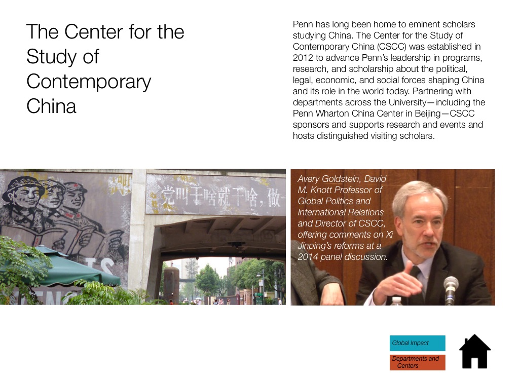 Penn has long been home to eminent scholars studying China. The Center for the Study of Contemporary China (CSCC) was established in 2012 to advance Penn’s leadership in programs, research, and scholarship about the political, legal, economic, and social forces shaping China and its role in the world today. Partnering with departments across the University—including the Penn Wharton China Center in Beijing—CSCC sponsors and supports research and events and hosts distinguished visiting scholars.