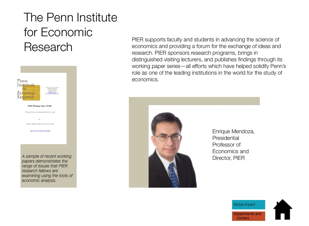 PIER supports faculty and students in advancing the science of economics and providing a forum for the exchange of ideas and research. PIER sponsors research programs, brings in distinguished visiting lecturers, and publishes findings through its working paper series—all efforts which have helped solidify Penn’s role as one of the leading institutions in the world for the study of economics.