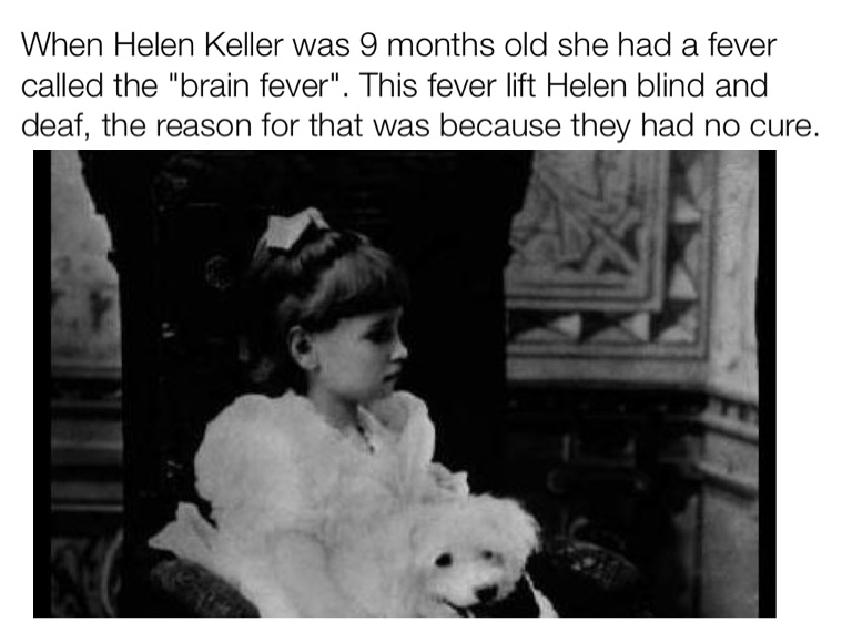When Helen Keller was 9 months old she had a fever called the "brain fever". This fever lift Helen blind and deaf, the reason for that was because they had no cure.