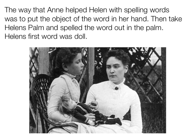 The way that Anne helped Helen with spelling words was to put the object of the word in her hand. Then take Helens Palm and spelled the word out in the palm. Helens first word was doll.