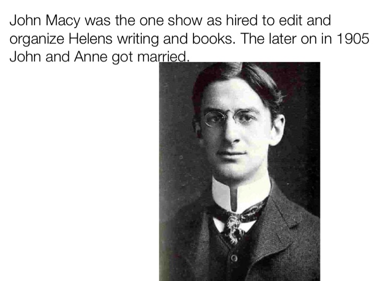 John Macy was the one show as hired to edit and organize Helens writing and books. The later on in 1905 John and Anne got married.