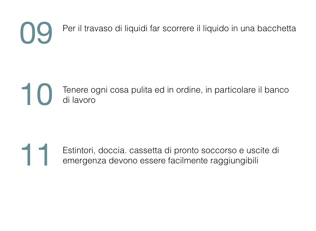 Estintori, doccia. cassetta di pronto soccorso e uscite di emergenza devono essere facilmente raggiungibili