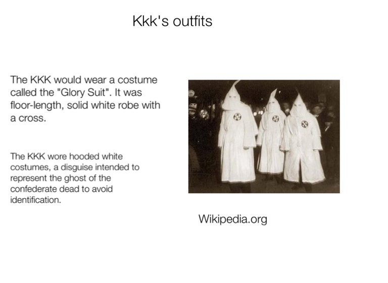 The KKK wore hooded white costumes, a disguise intended to represent the ghost of the confederate dead to avoid identification.