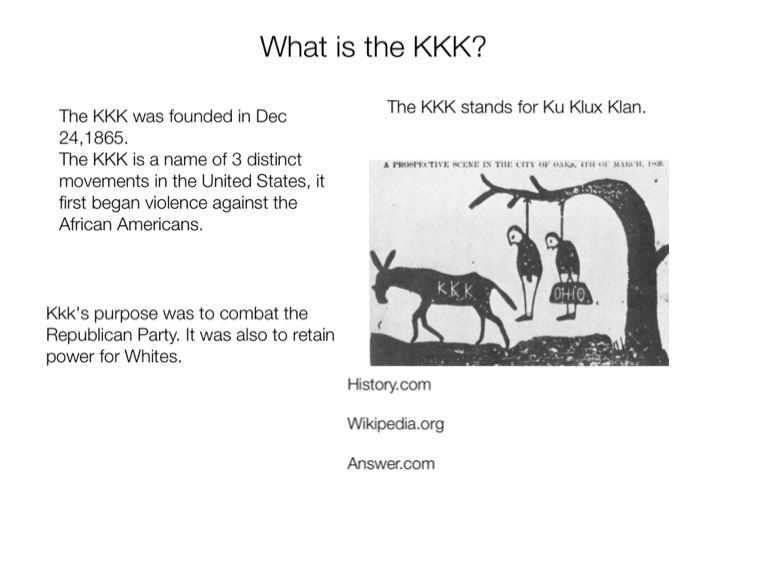 The KKK is a name of 3 distinct movements in the United States, it first began violence against the African Americans.