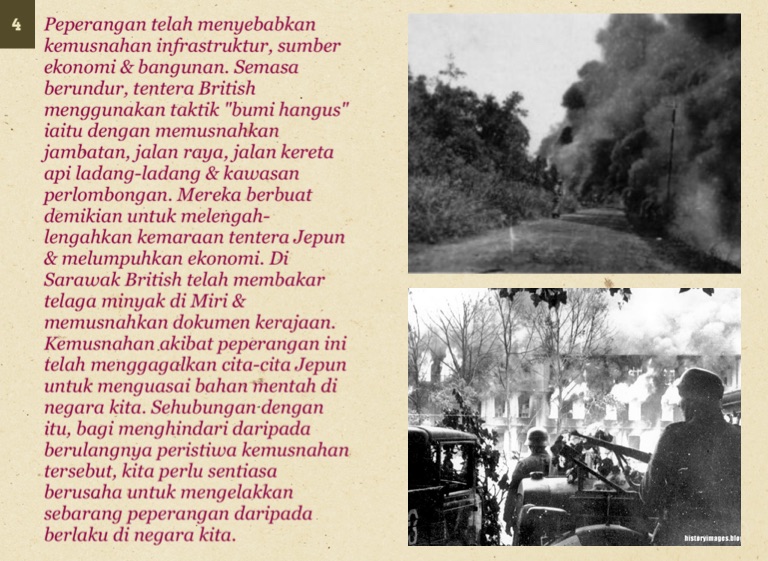 Peperangan telah menyebabkan kemusnahan infrastruktur, sumber ekonomi & bangunan. Semasa berundur, tentera British menggunakan taktik "bumi hangus" iaitu dengan memusnahkan jambatan, jalan raya, jalan kereta api ladang-ladang & kawasan perlombongan. Mereka berbuat demikian untuk melengah-lengahkan kemaraan tentera Jepun & melumpuhkan ekonomi. Di Sarawak British telah membakar telaga minyak di Miri & memusnahkan dokumen kerajaan. Kemusnahan akibat peperangan ini telah menggagalkan cita-cita Jepun untuk menguasai bahan mentah di negara kita. Sehubungan dengan itu, bagi menghindari daripada berulangnya peristiwa kemusnahan tersebut, kita perlu sentiasa berusaha untuk mengelakkan sebarang peperangan daripada berlaku di negara kita.