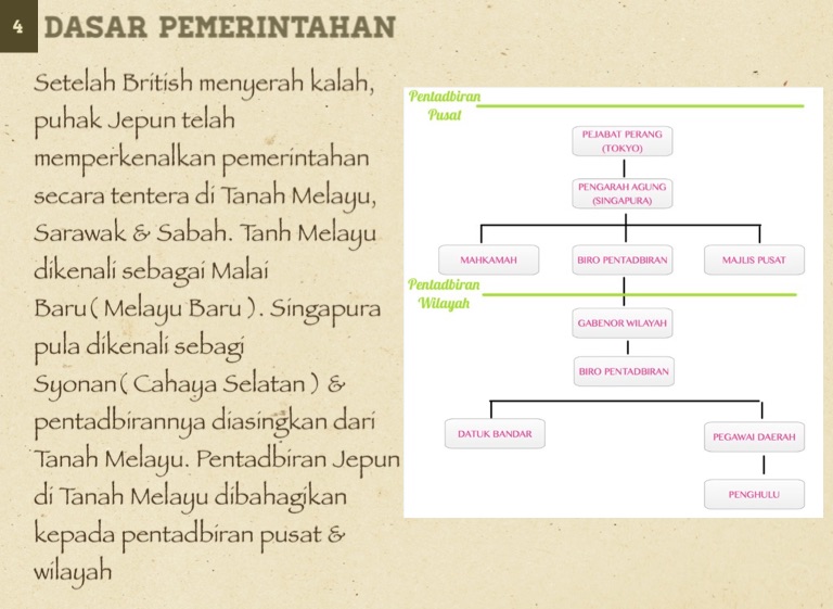 Setelah British menyerah kalah, puhak Jepun telah memperkenalkan pemerintahan secara tentera di Tanah Melayu, Sarawak & Sabah. Tanh Melayu dikenali sebagai Malai Baru( Melayu Baru ). Singapura pula dikenali sebagi Syonan( Cahaya Selatan ) & pentadbirannya diasingkan dari Tanah Melayu. Pentadbiran Jepun di Tanah Melayu dibahagikan kepada pentadbiran pusat & wilayah