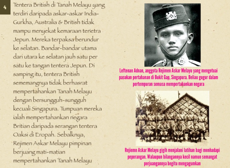 Leftenan Adnan, anggota Rejimen Askar Melayu yang mengetuai pasukan pertahanan di Bukit Gap, Singapura. Beliau gugur dalam pertempuran semasa mempertahankan negara