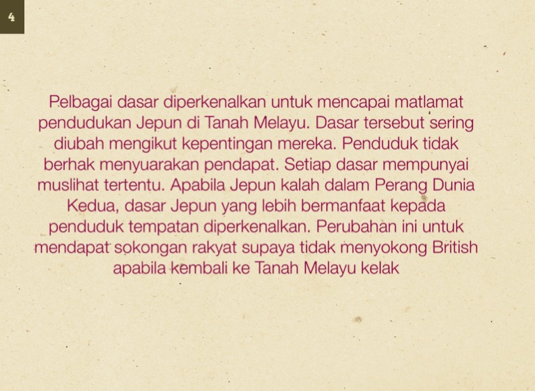 Pelbagai dasar diperkenalkan untuk mencapai matlamat pendudukan Jepun di Tanah Melayu. Dasar tersebut sering diubah mengikut kepentingan mereka. Penduduk tidak berhak menyuarakan pendapat. Setiap dasar mempunyai muslihat tertentu. Apabila Jepun kalah dalam Perang Dunia Kedua, dasar Jepun yang lebih bermanfaat kepada penduduk tempatan diperkenalkan. Perubahan ini untuk mendapat sokongan rakyat supaya tidak menyokong British apabila kembali ke Tanah Melayu kelak