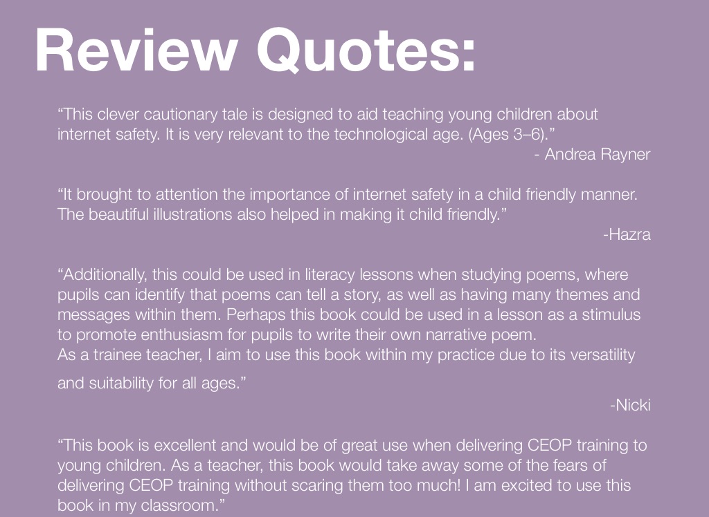“This book is excellent and would be of great use when delivering CEOP training to young children. As a teacher, this book would take away some of the fears of delivering CEOP training without scaring them too much! I am excited to use this book in my classroom.”