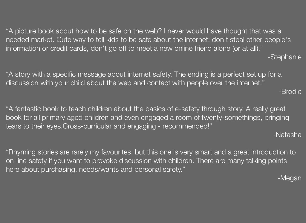 “A fantastic book to teach children about the basics of e-safety through story. A really great book for all primary aged children and even engaged a room of twenty-somethings, bringing tears to their eyes.Cross-curricular and engaging - recommended!”