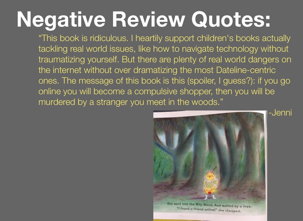 “This book is ridiculous. I heartily support children's books actually tackling real world issues, like how to navigate technology without traumatizing yourself. But there are plenty of real world dangers on the internet without over dramatizing the most Dateline-centric ones. The message of this book is this (spoiler, I guess?): if you go online you will become a compulsive shopper, then you will be murdered by a stranger you meet in the woods.”