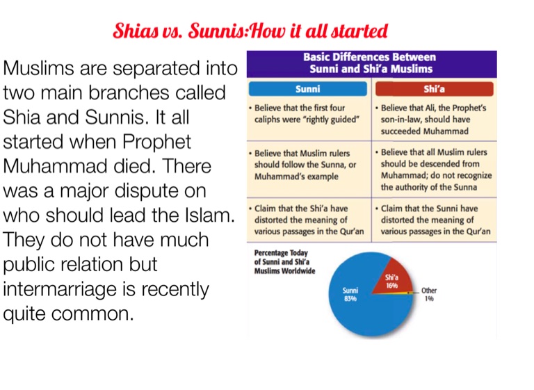 Muslims are separated into two main branches called Shia and Sunnis. It all started when Prophet Muhammad died. There was a major dispute on who should lead the Islam. They do not have much public relation but intermarriage is recently quite common.