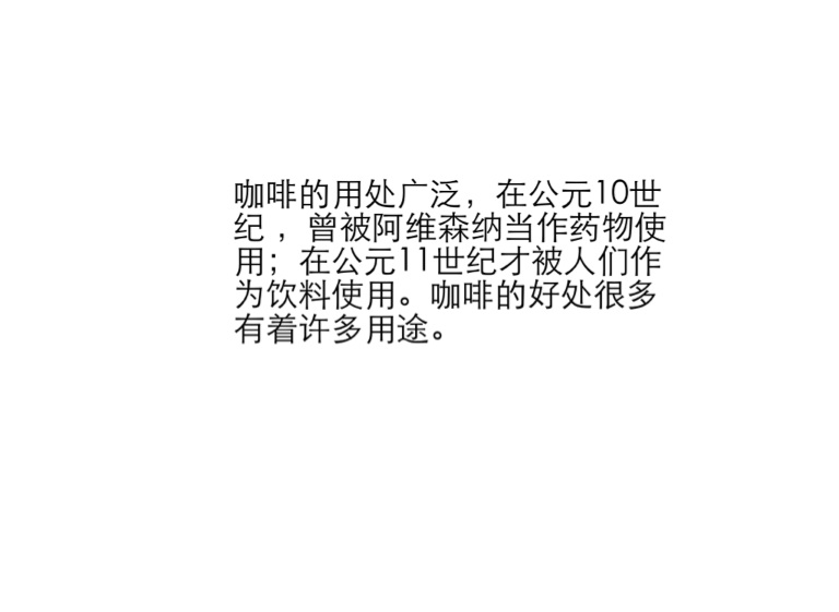 咖啡的用处广泛,在公元10世纪 ,曾被阿维森纳当作药物使用;在公元11世纪才被人们作为饮料使用。咖啡的好处很多有着许多用途。