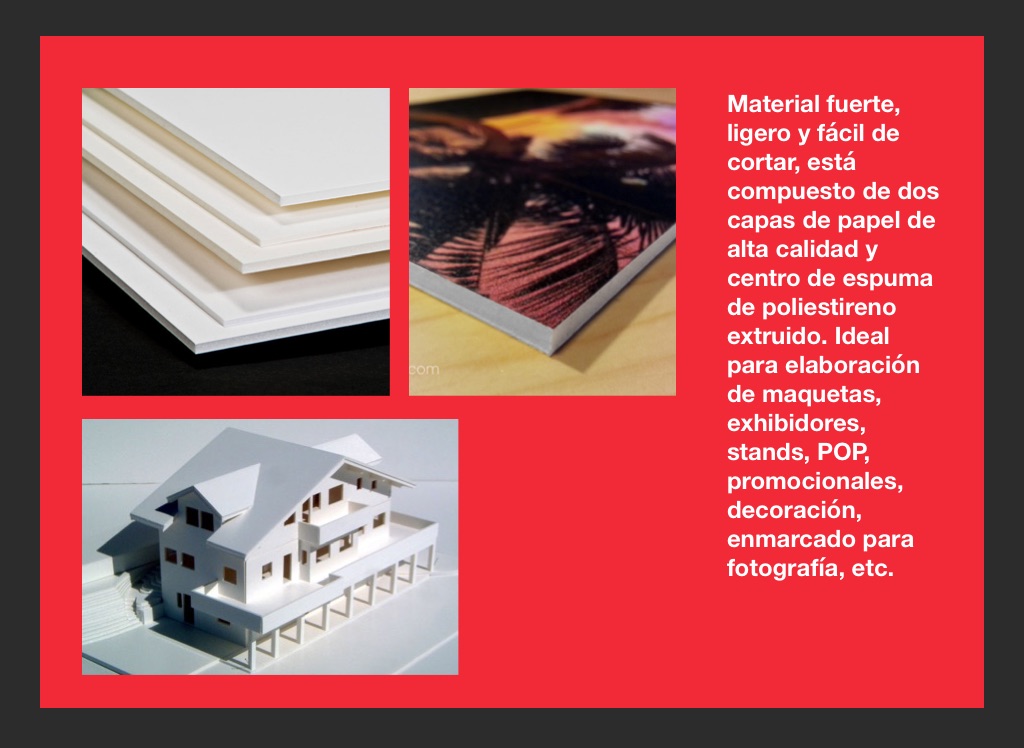 Material fuerte, ligero y fácil de cortar, está compuesto de dos capas de papel de alta calidad y centro de espuma de poliestireno extruido. Ideal para elaboración de maquetas, exhibidores, stands, POP, promocionales, decoración, enmarcado para fotografía, etc.