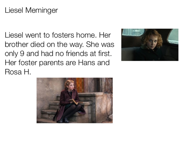 Liesel went to fosters home. Her brother died on the way. She was only 9 and had no friends at first. Her foster parents are Hans and Rosa H.
