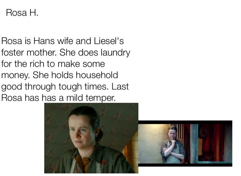 Rosa is Hans wife and Liesel's foster mother. She does laundry for the rich to make some money. She holds household good through tough times. Last Rosa has has a mild temper.
