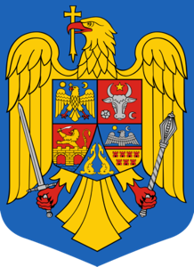 Symbols: coat of arms 1992 gold eagle against a blue background holding a cross in its beak and a sword in one claw, a scepter in the other claw, 5 produces on chest Walachia, Moldavia, Transylvania, banat, and Dobruja.
