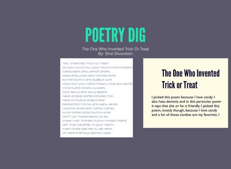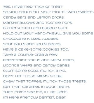 I picked this poem because I love candy. I also hate dentists and in this particular poem it says that she or he is friendly. I picked this poem, mostly though, because I love candy and a lot of those candies are my favorites. I