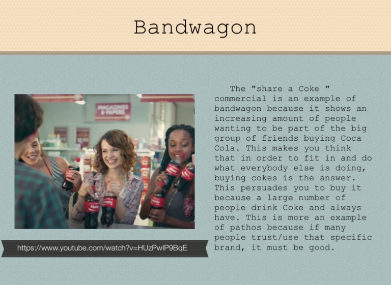 The "share a Coke " commercial is an example of bandwagon because it shows an increasing amount of people wanting to be part of the big group of friends buying Coca Cola. This makes you think that in order to fit in and do what everybody else is doing, buying cokes is the answer. This persuades you to buy it because a large number of people drink Coke and always have. This is more an example of pathos because if many people trust/use that specific brand, it must be good.