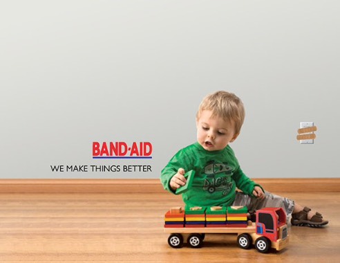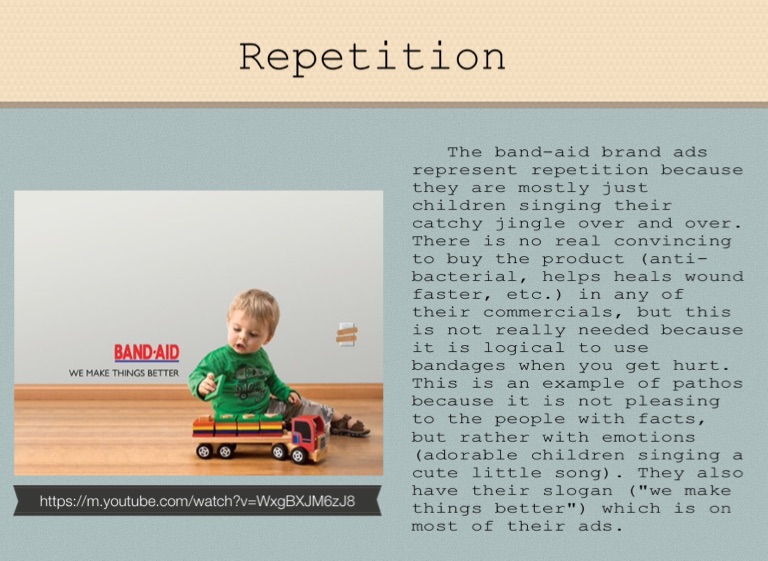 The band-aid brand ads represent repetition because they are mostly just children singing their catchy jingle over and over. There is no real convincing to buy the product (anti-bacterial, helps heals wound faster, etc.) in any of their commercials, but this is not really needed because it is logical to use bandages when you get hurt. This is an example of pathos because it is not pleasing to the people with facts, but rather with emotions (adorable children singing a cute little song). They also have their slogan ("we make things better") which is on most of their ads.
