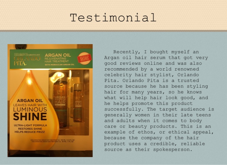 Recently, I bought myself an Argan oil hair serum that got very good reviews online and was also recommended by a world renowned celebrity hair stylist, Orlando Pita. Orlando Pita is a trusted source because he has been styling hair for many years, so he knows what will help hair look good, and he helps promote this product successfully. The target audience is generally women in their late teens and adults when it comes to body care or beauty products. This is an example of ethos, or ethical appeal, because the company of the hair product uses a credible, reliable source as their spokesperson.