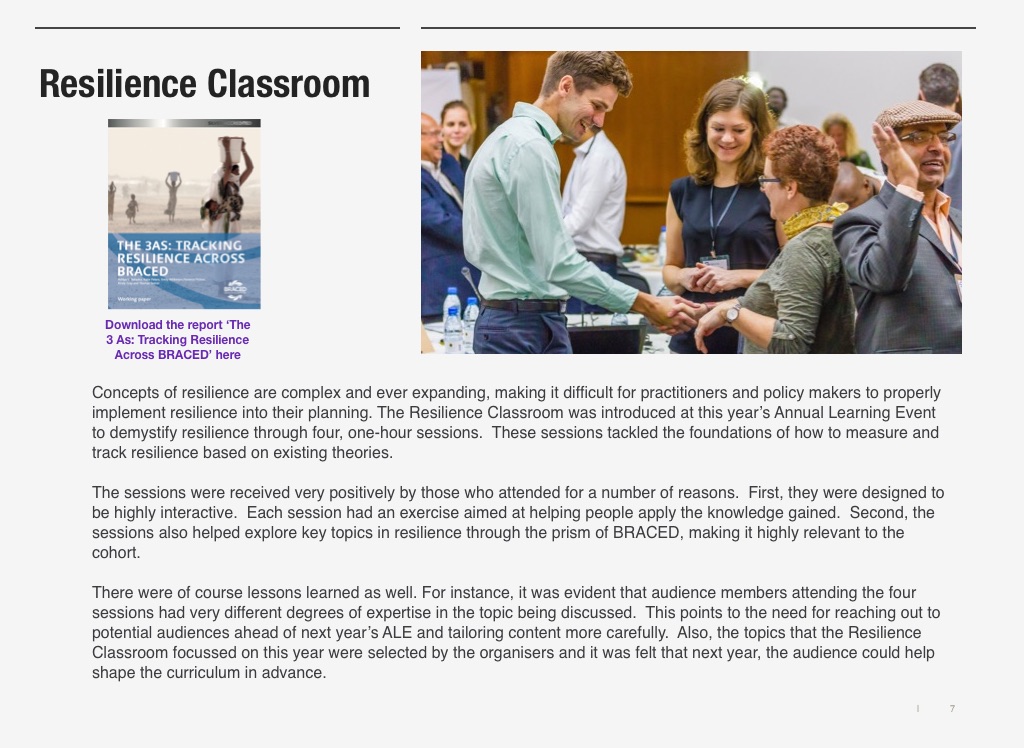 The sessions were received very positively by those who attended for a number of reasons. First, they were designed to be highly interactive. Each session had an exercise aimed at helping people apply the knowledge gained. Second, the sessions also helped explore key topics in resilience through the prism of BRACED, making it highly relevant to the cohort.