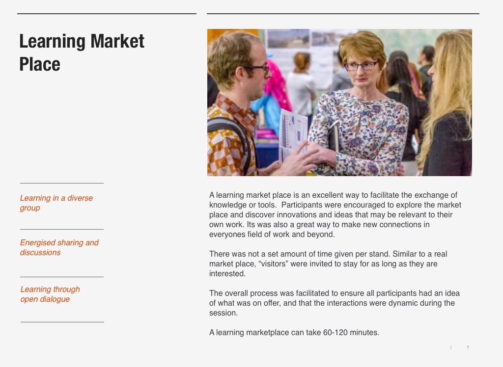 A learning market place is an excellent way to facilitate the exchange of knowledge or tools. Participants were encouraged to explore the market place and discover innovations and ideas that may be relevant to their own work. Its was also a great way to make new connections in everyones field of work and beyond.