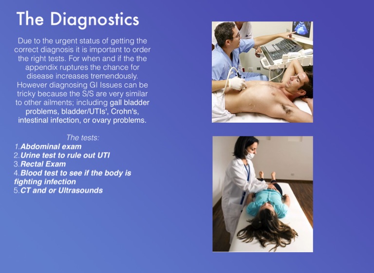 Due to the urgent status of getting the correct diagnosis it is important to order the right tests. For when and if the the appendix ruptures the chance for disease increases tremendously. However diagnosing GI Issues can be tricky because the S/S are very similar to other ailments; including gall bladder problems, bladder/UTIs', Crohn's, intestinal infection, or ovary problems.