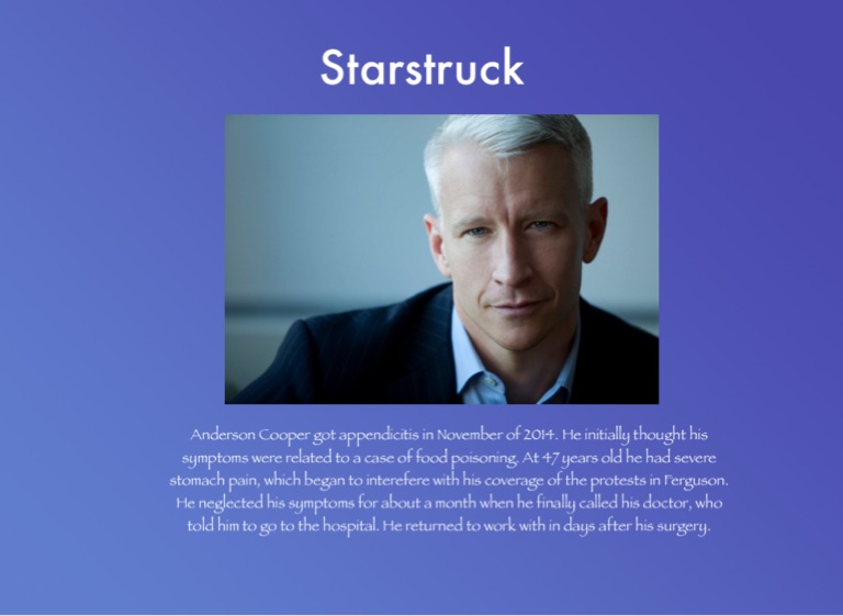 Anderson Cooper got appendicitis in November of 2014. He initially thought his symptoms were related to a case of food poisoning. At 47 years old he had severe stomach pain, which began to interefere with his coverage of the protests in Ferguson. He neglected his symptoms for about a month when he finally called his doctor, who told him to go to the hospital. He returned to work with in days after his surgery.