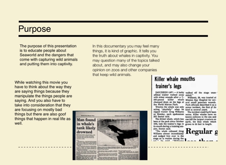 The purpose of this presentation is to educate people about Seaworld and the dangers that come with capturing wild animals and putting them into captivity.
