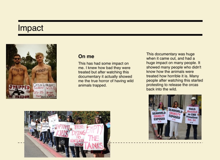This documentary was huge when it came out, and had a huge impact on many people. It showed many people who didn't know how the animals were treated how horrible it is. Many people after watching this started protesting to release the orcas back into the wild.