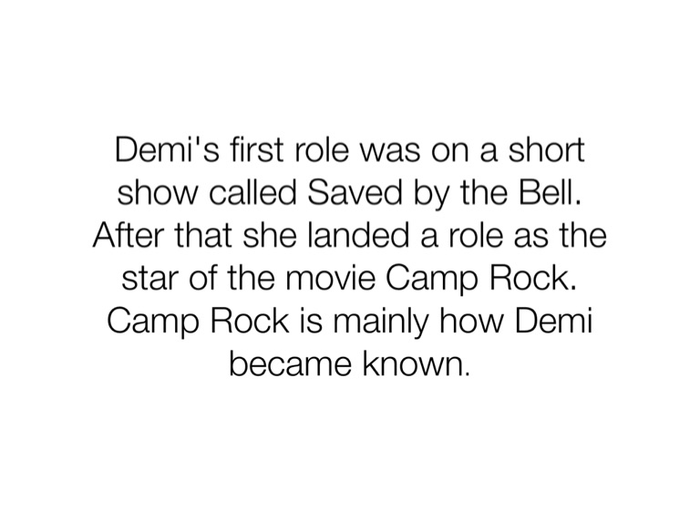 Demi's first role was on a short show called Saved by the Bell. After that she landed a role as the star of the movie Camp Rock. Camp Rock is mainly how Demi became known.