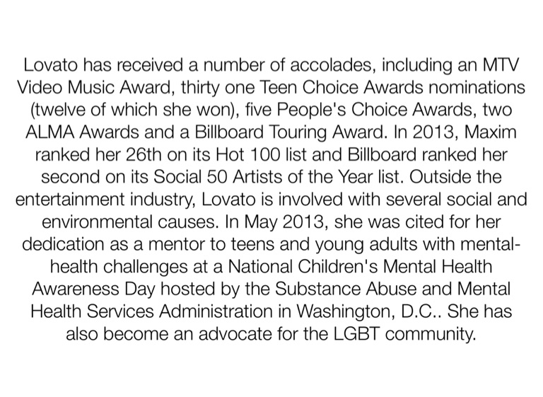 Lovato has received a number of accolades, including an MTV Video Music Award, thirty one Teen Choice Awards nominations (twelve of which she won), five People's Choice Awards, two ALMA Awards and a Billboard Touring Award. In 2013, Maxim ranked her 26th on its Hot 100 list and Billboard ranked her second on its Social 50 Artists of the Year list. Outside the entertainment industry, Lovato is involved with several social and environmental causes. In May 2013, she was cited for her dedication as a mentor to teens and young adults with mental-health challenges at a National Children's Mental Health Awareness Day hosted by the Substance Abuse and Mental Health Services Administration in Washington, D.C.. She has also become an advocate for the LGBT community.