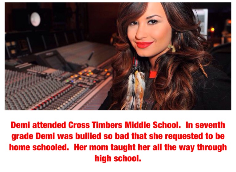 Demi attended Cross Timbers Middle School. In seventh grade Demi was bullied so bad that she requested to be home schooled. Her mom taught her all the way through high school.