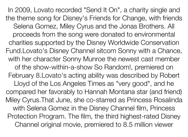 In 2009, Lovato recorded "Send It On", a charity single and the theme song for Disney's Friends for Change, with friends Selena Gomez, Miley Cyrus and the Jonas Brothers. All proceeds from the song were donated to environmental charities supported by the Disney Worldwide Conservation Fund.Lovato's Disney Channel sitcom Sonny with a Chance, with her character Sonny Munroe the newest cast member of the show-within-a-show So Random!, premiered on February 8.Lovato's acting ability was described by Robert Lloyd of the Los Angeles Times as "very good", and he compared her favorably to Hannah Montana star (and friend) Miley Cyrus.That June, she co-starred as Princess Rosalinda with Selena Gomez in the Disney Channel film, Princess Protection Program. The film, the third highest-rated Disney Channel original movie, premiered to 8.5 million viewer