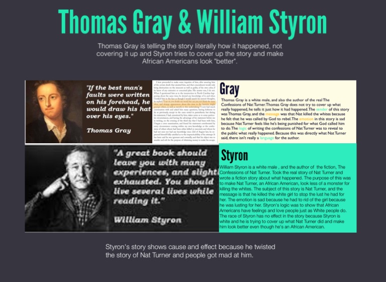 Thomas Gray is telling the story literally how it happened, not covering it up and Styron tries to cover up the story and make African Americans look "better".