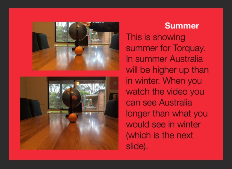 This is showing summer for Torquay. In summer Australia will be higher up than in winter. When you watch the video you can see Australia longer than what you would see in winter (which is the next slide).