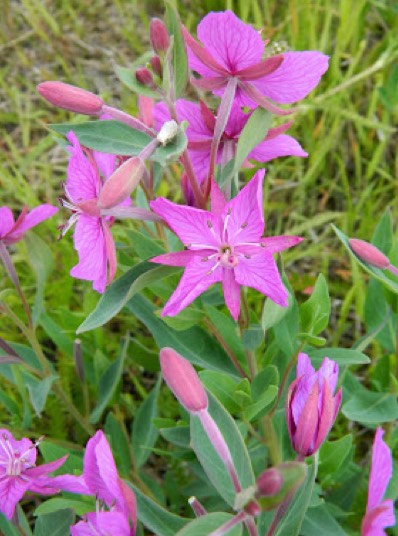⚫ The Fireweed's closest relative is the Dwarf Fireweed (Epilobium latifolium). The height range of the Dwarf Fireweed is about 1 to 2 feet tall. In the photo on the right you can see that the larger pink petals alternate with sepals just like the Fireweed.