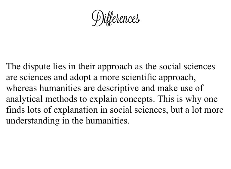The dispute lies in their approach as the social sciences are sciences and adopt a more scientific approach, whereas humanities are descriptive and make use of analytical methods to explain concepts. This is why one finds lots of explanation in social sciences, but a lot more understanding in the humanities.