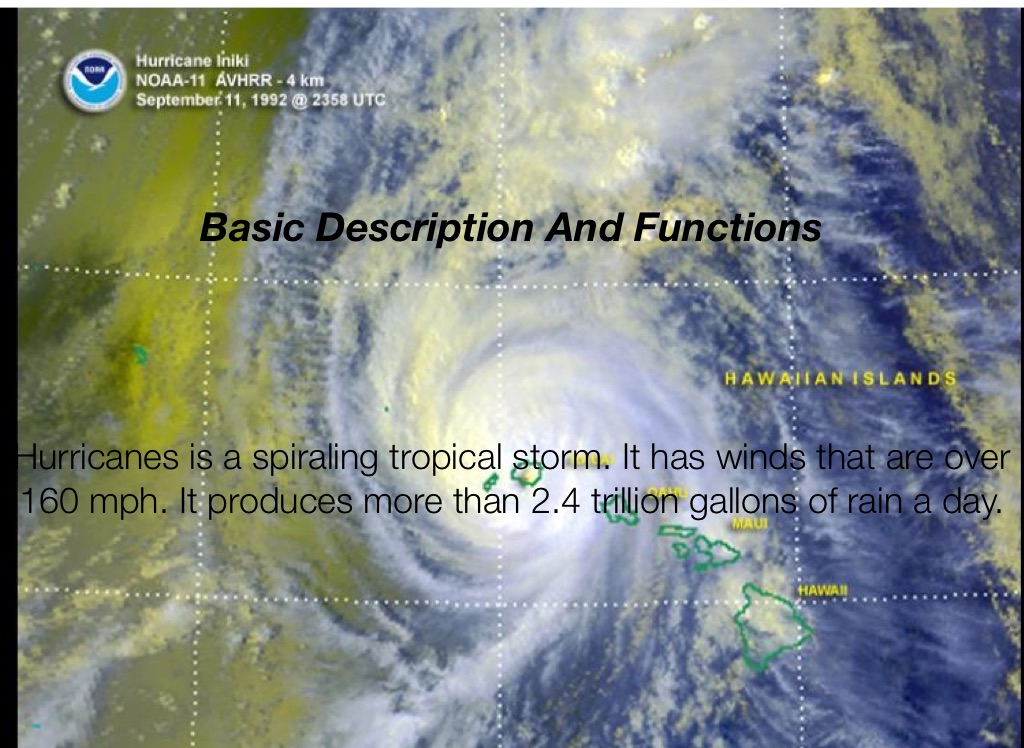 Hurricanes is a spiraling tropical storm. It has winds that are over 160 mph. It produces more than 2.4 trillion gallons of rain a day.