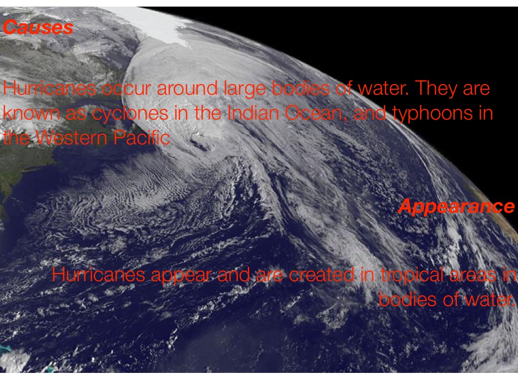Hurricanes occur around large bodies of water. They are known as cyclones in the Indian Ocean, and typhoons in the Western Pacific