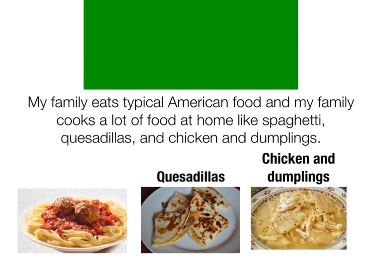 My family eats typical American food and my family cooks a lot of food at home like spaghetti, quesadillas, and chicken and dumplings.