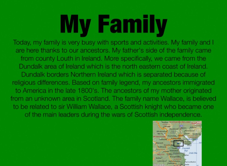 Today, my family is very busy with sports and activities. My family and I are here thanks to our ancestors. My father's side of the family came from county Louth in Ireland. More specifically, we came from the Dundalk area of Ireland which is the north eastern coast of Ireland. Dundalk borders Northern Ireland which is separated because of religious differences. Based on family legend, my ancestors immigrated to America in the late 1800's. The ancestors of my mother originated from an unknown area in Scotland. The family name Wallace, is believed to be related to sir William Wallace, a Scottish knight who became one of the main leaders during the wars of Scottish independence.
