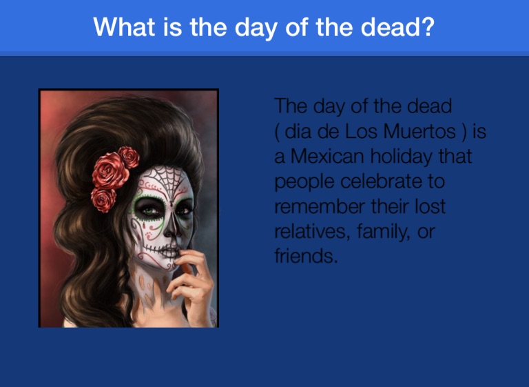 The day of the dead ( dia de Los Muertos ) is a Mexican holiday that people celebrate to remember their lost relatives, family, or friends.