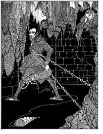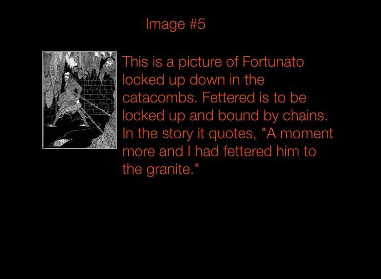 This is a picture of Fortunato locked up down in the catacombs. Fettered is to be locked up and bound by chains. In the story it quotes, "A moment more and I had fettered him to the granite."