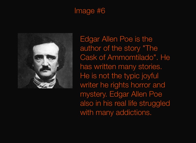 Edgar Allen Poe is the author of the story "The Cask of Ammomtilado". He has written many stories. He is not the typic joyful writer he rights horror and mystery. Edgar Allen Poe also in his real life struggled with many addictions.