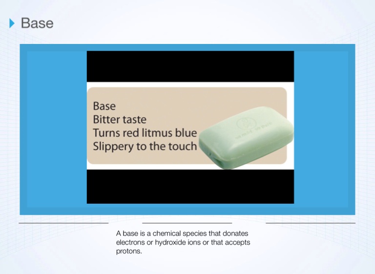 A base is a chemical species that donates electrons or hydroxide ions or that accepts protons.