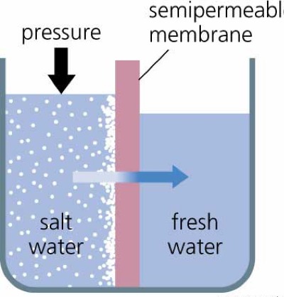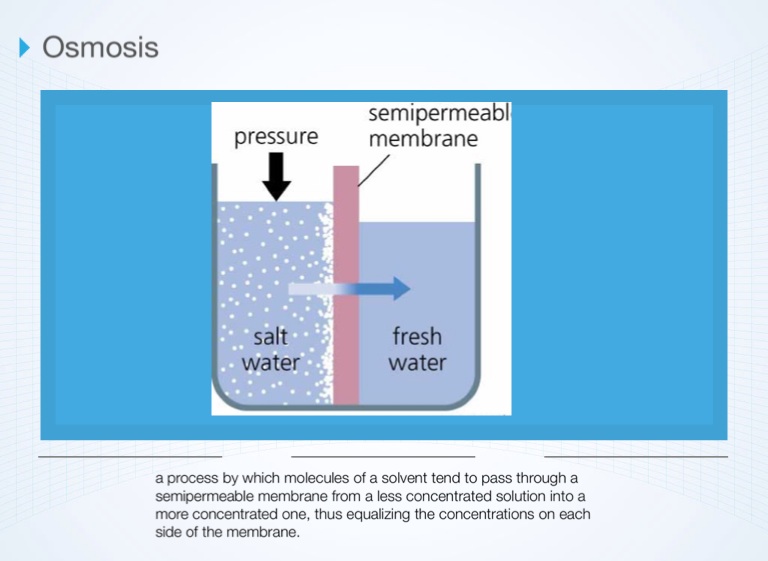 a process by which molecules of a solvent tend to pass through a semipermeable membrane from a less concentrated solution into a more concentrated one, thus equalizing the concentrations on each side of the membrane.